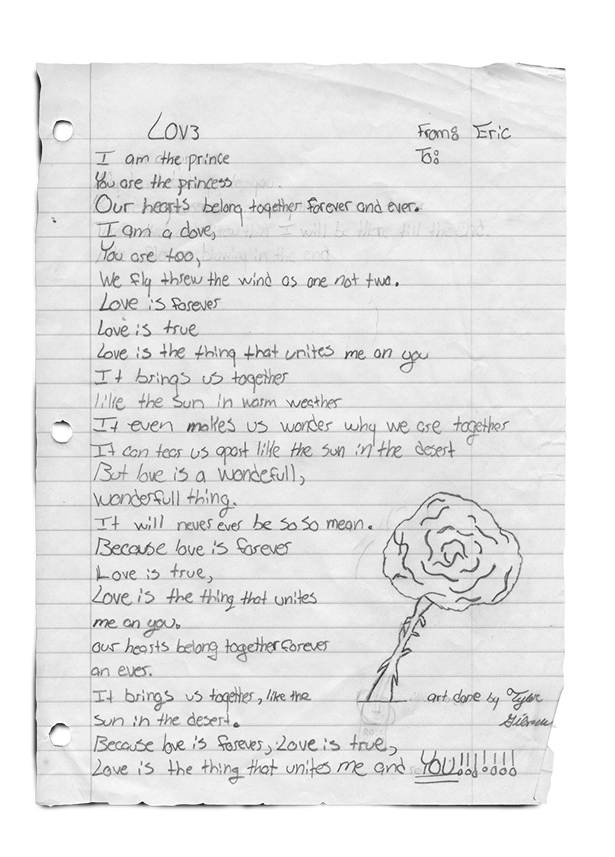 Eric Fluellen was dyslexic, placed in special education and held back several grades. In class he often wrote raps, poems and stories. When he died he left notebooks full of journal writings and loose papers that give insights into his thoughts growing up.