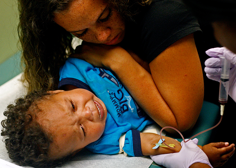 Jasmine holds down Bryson and tries to comfort him as a nurse draws blood during a July 2013 visit to Erlanger. Jasmine said that at first it was very difficult for her to watch procedures performed on her children or stay with them in the hospital, but over time it has become easier.