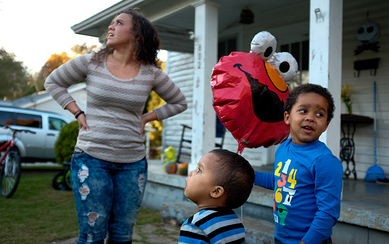 Jasmine and Bryson watch as a balloon he released floats away into the air in front of their home as Kaivon gets ready to let go of another.