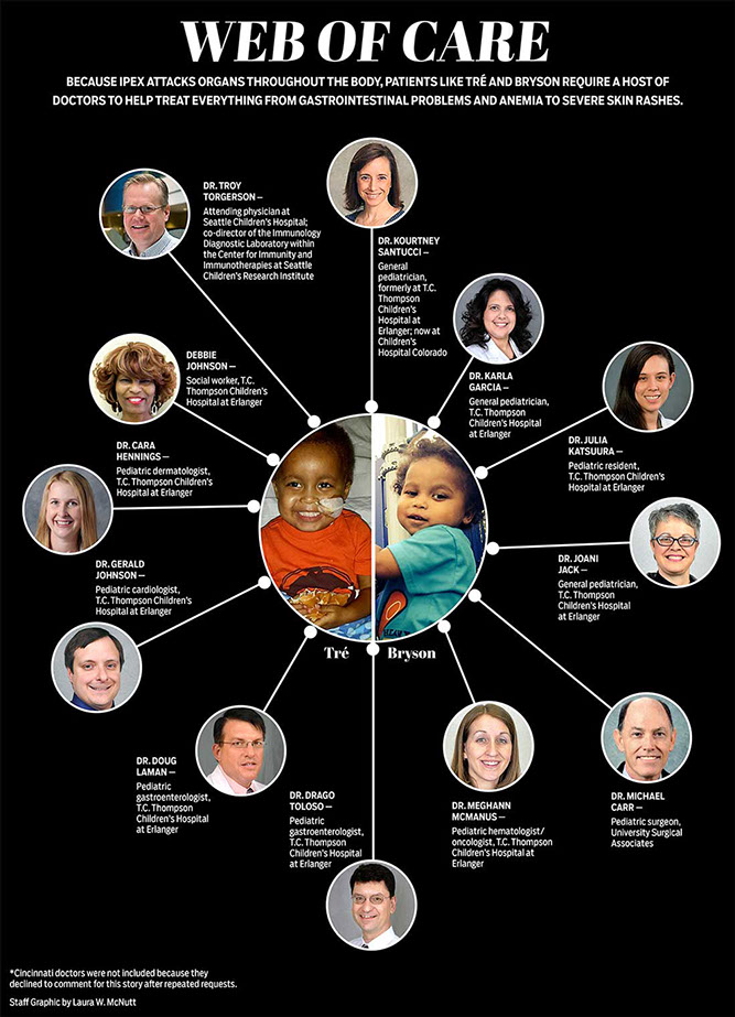 Five months passed before a doctor from Cincinnati called, saying they found something in Tré’s and Bryson’s tests: A very peculiar mutation on a very particular gene. It was a disease called IPEX syndrome, the doctor on the phone explained. The strange name was more comprehensible than the things he said next: